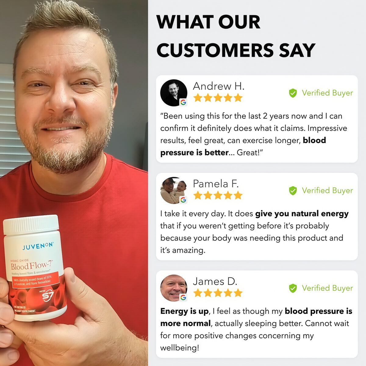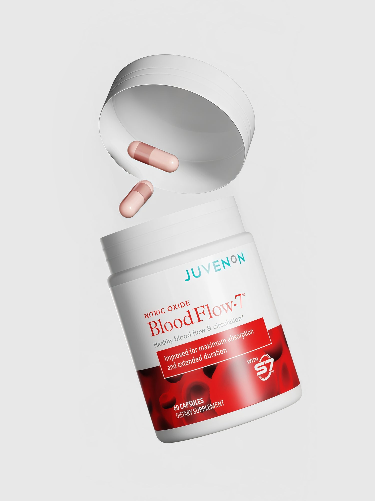 Juvenon's BloodFlow-7 formula contains natural, safe, and clinically researched ingredients that can boost your nitric oxide levels by 230% to improve blood circulation and help maintain healthy blood pressure. Studies have shown that nitric oxide supplements can help maintain healthy pressure. The FDA has not evaluated these statements. This product is not intended to treat, cure, or prevent diseases.